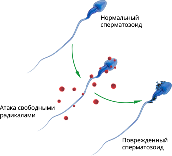 Нарушение фертильности связано с ухудшением качества спермы. Первопричина отклонений в большинстве случаев остается неясной. Но у многих мужчин определяется общий механизм, который негативно влияет на параметры спермы — это окислительный стресс. Проще говоря, в семенной жидкости образуется избыточное количество активных форм кислорода (или по-другому, свободных радикалов), которые повреждают половые клетки и снижают их способность к оплодотворению.